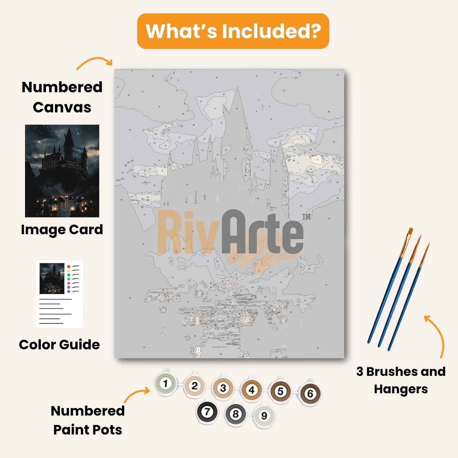 Every kit comes with a numbered canvas, acrylic paints, three precision brushes, a color reference card, and hanging tools. Everything you need is inside — no extra materials required.