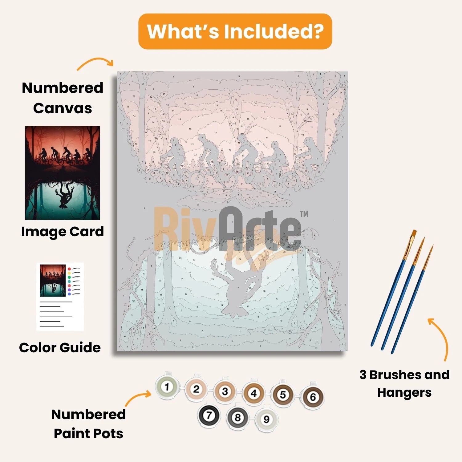 Every kit comes with a numbered canvas, acrylic paints, three precision brushes, a color reference card, and hanging tools. Everything you need is inside — no extra materials required.